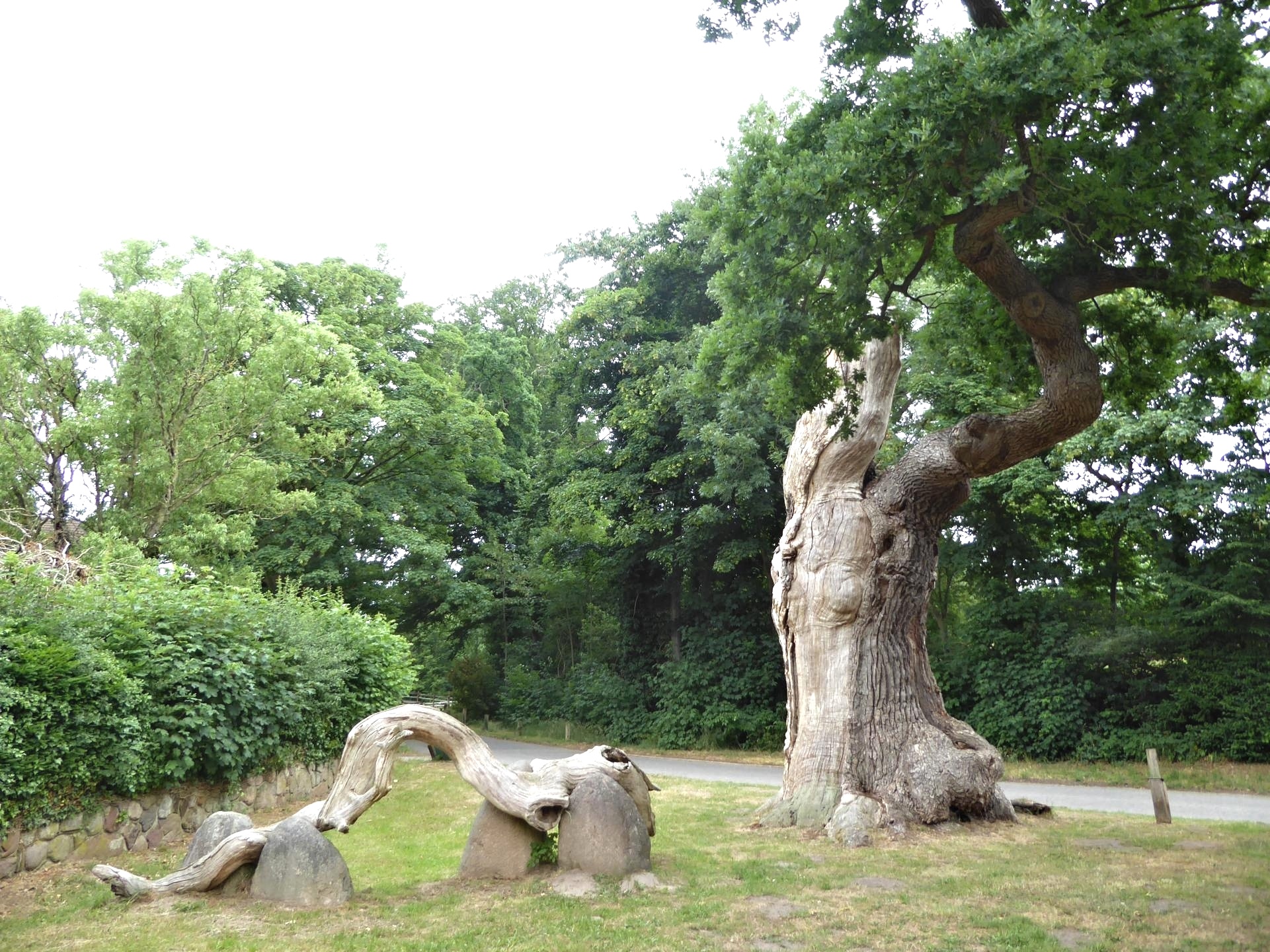 Beeindruckend auch die denkmalgeschützte 1000jährige Eiche, die durch Blitzschlag stark beschädigt wurde ,aber mit einem seitlichen Ast ums Überleben kämpft.
